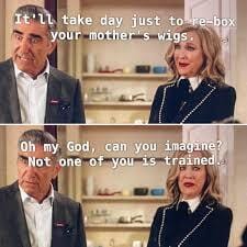 If I do lose my hair — Stratford’s Moira Rose, here I come — wigs, mascara, lipstick… watch out, world!
